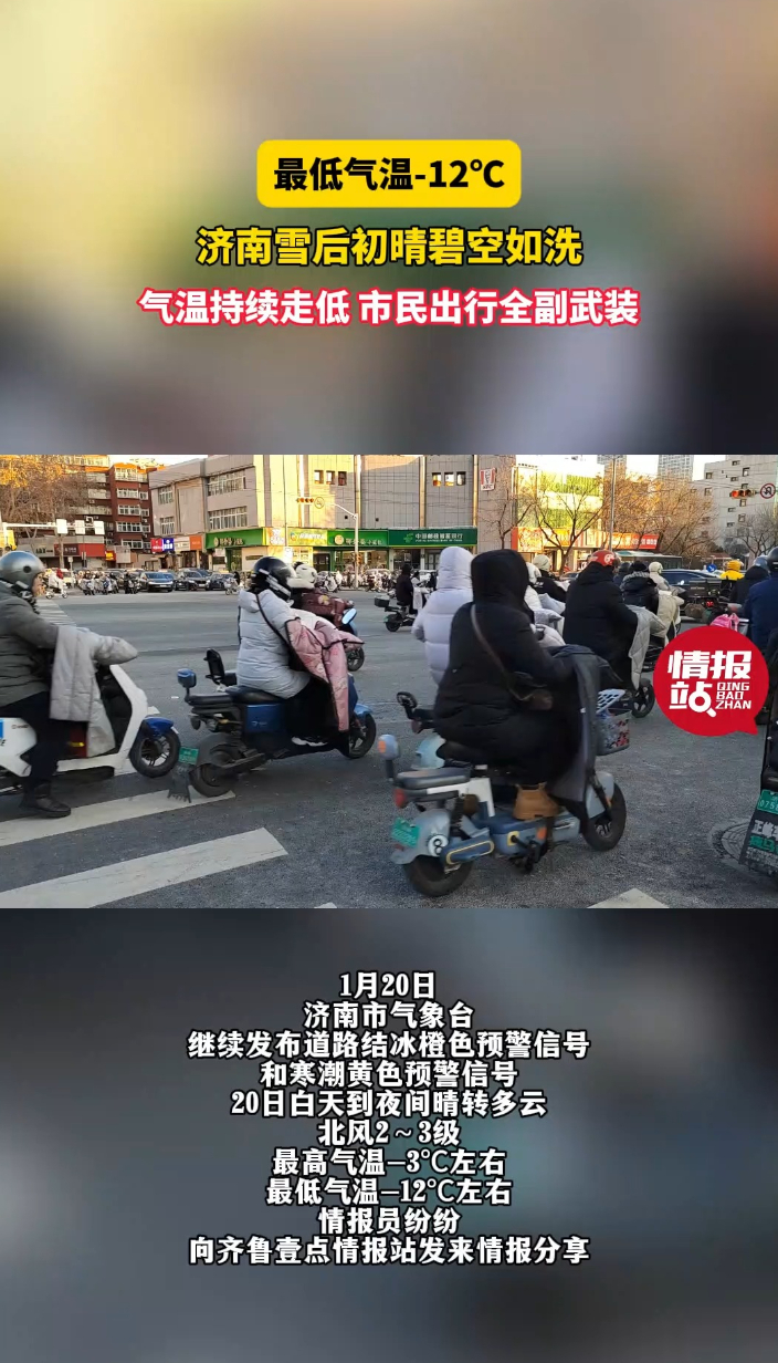 天气情报站|-12℃!济南雪后初晴碧空如洗,市民出行全副武装齐鲁壹点 | 09:38 大众报业·齐鲁壹点 微信扫码扫码下载客户端1月20日,正值大寒节气,济南气温持续走低,情报员纷纷向齐鲁晚报官方客户端齐鲁壹点情报站发来情报,“走在路上手和脸冻得生疼,北风呼呼地刮,感觉是真冷呀!路上的行人也是全副武装”“雪后初晴的济南 泉城蓝今天上线啦!”“大寒节气,济南雪后放晴了,冷蓝冷蓝的天空,令人陶醉”情报员说,你所在的城市天气怎么样?欢迎来分享~
