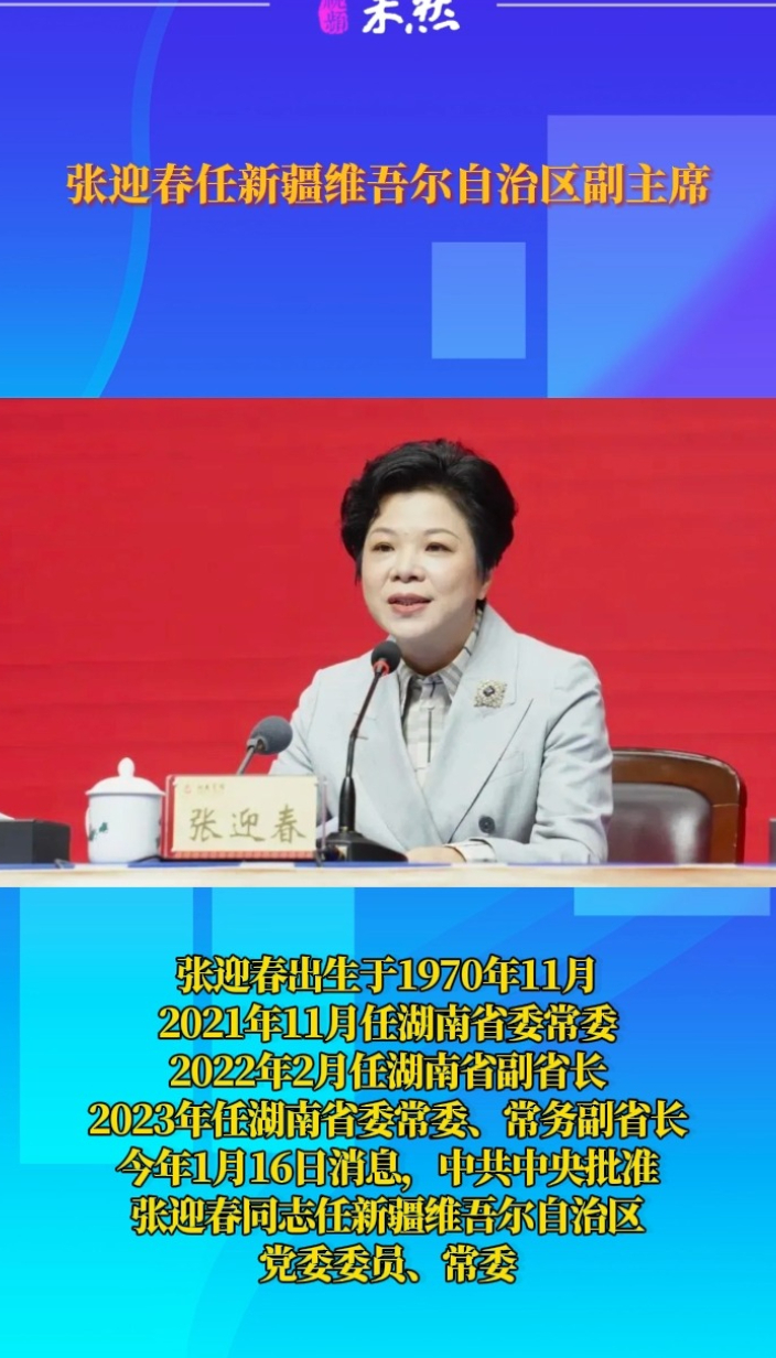 观政视频|张迎春任新疆维吾尔自治区副主席 12:06 原创齐鲁晚报·齐鲁壹点客户端 微信扫码扫码下载客户端“新疆日报”微信公众号消息,1月19日,新疆维吾尔自治区十四届人大常委会第二十七次会议通过,决定任命张迎春为自治区副主席。