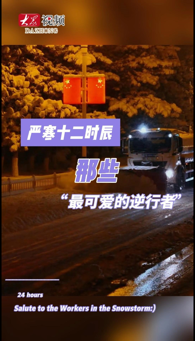 严寒十二时辰,请看山东“最可爱的逆行者”大众新闻 12:59现场近日,山东省经历了今年首场大范围雨雪冰冻天气。小编记录齐鲁大地上环卫工人、交通警察、外卖小哥等无数风雪中的逆行者,从子夜除冰到深夜坚守的完整一天。正是他们的担当,让积雪消融、秩序如常。致敬风雪中每一位逆行者。(大众新闻编辑 任思飞,大众新闻、海报新闻、果然视频、大众号“更济宁”“淄博警方”联合共创)