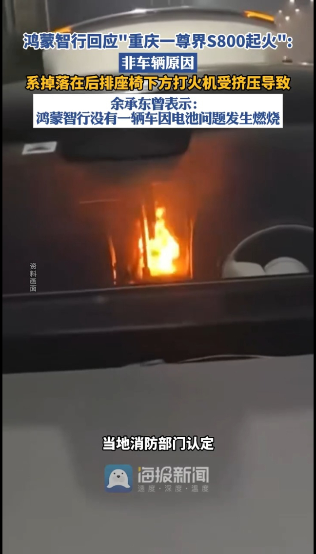 1月19日,鸿蒙智行发言人发文回应“尊界S800自燃起火”一事称,当地消防部门认定,事件系掉落在后排座椅下方打火机受挤压导致,非车辆原因,将协助客户妥善处理后续事宜。