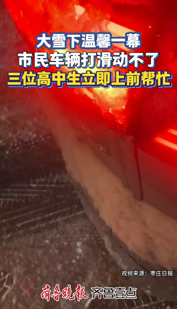 大雪下温馨一幕,市民车辆打滑动不了三位高中生立即上前帮忙