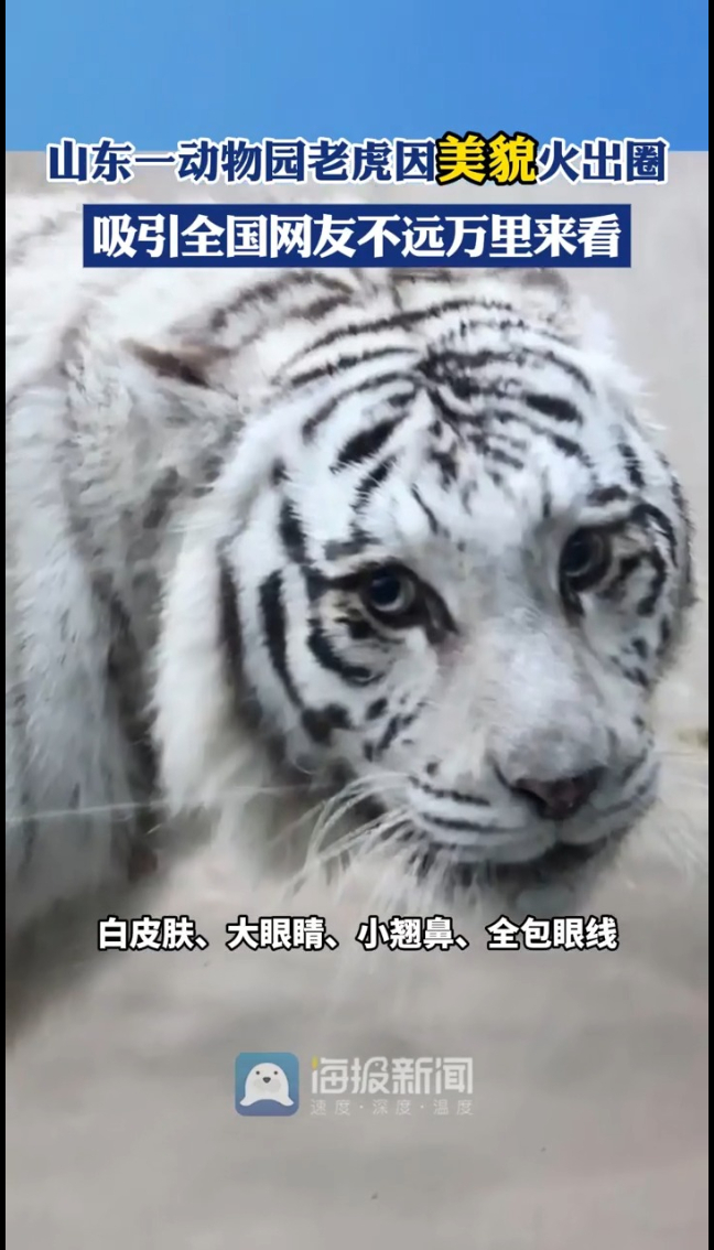 没想到还有长相如此美貌的老虎!白皮肤、大眼睛、小翘鼻、全包眼线……你能想到的诸多夸赞美女的词汇,如今都用在这只老虎的身上。近日,青岛动物园的孟加拉白虎“小孬”因美貌火出圈,全国网友坐飞机乘高铁不远万里来看她。不少网友“惊呼”,没想到还有长相如此漂亮的老虎!无论睡觉、吃饭、生气,还是发呆,每一面都让人一眼惊艳。据饲养员华玉龙介绍,“小孬”是个性格腼腆的女孩子,今年10周岁,是园区的“明星”老虎。(海报新闻综合半岛都市报 编辑 冯浩 黄晓荣)