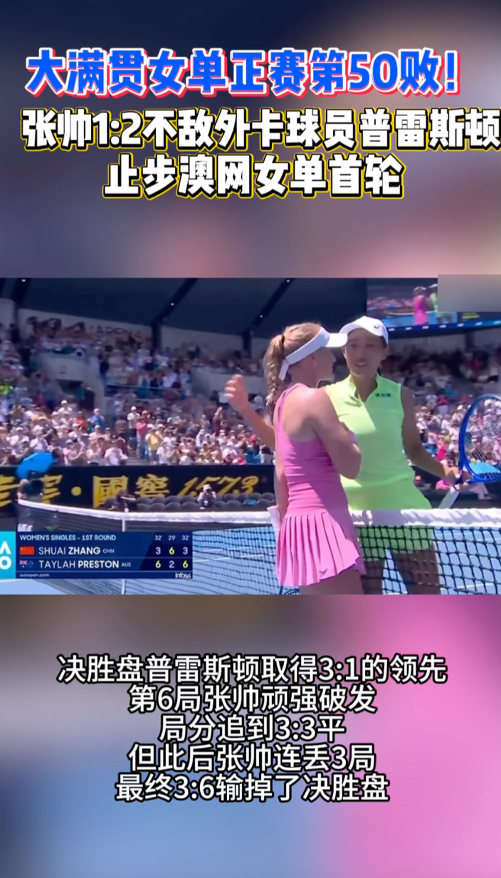 果然视频|张帅1:2不敌外卡球员普雷斯顿,止步澳网女单首轮 15:03 原创齐鲁晚报·齐鲁壹点客户端 微信扫码扫码下载客户端1月20日,2026澳大利亚网球公开赛继续展开女单首轮争夺。中国球员张帅激战三盘,最终以3:6、6:2、3:6不敌本土外卡球员普雷斯顿,遗憾止步首轮。(齐鲁晚报·齐鲁壹点 怀晓)