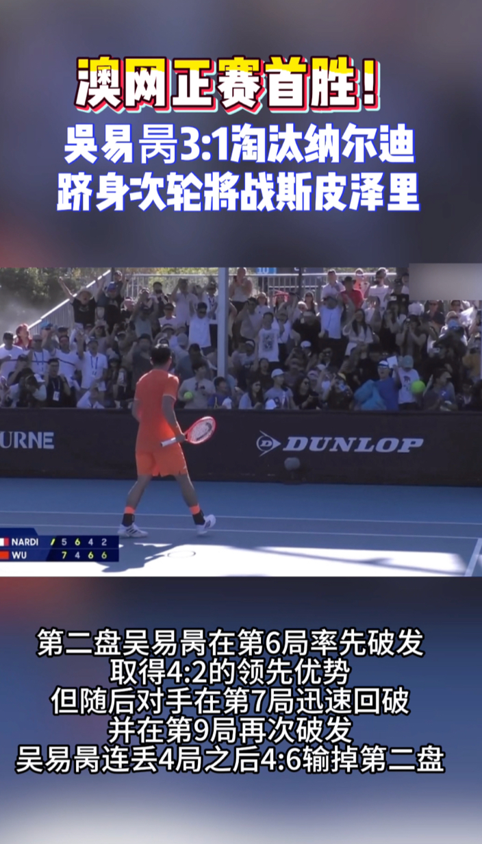 果然视频|吴易昺3:1击败纳尔迪,职业生涯首获澳网正赛胜利 15:21 原创齐鲁晚报·齐鲁壹点客户端 微信扫码扫码下载客户端1月20日,2026澳网展开正赛首轮第三比赛日的争夺。男单比赛中,从资格赛突围的吴易昺激战四盘,以7:5、4:6、6:4、6:2击败意大利选手纳尔迪,职业生涯首次收获澳网正赛的胜利。(齐鲁晚报·齐鲁壹点 怀晓)