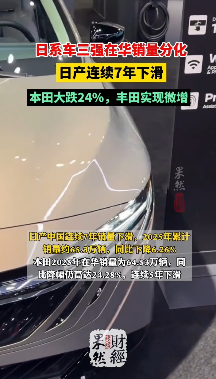 果然财经|日系车三强在华销量分化,本田大跌24%齐鲁晚报·齐鲁壹点客户端 15:48原创日系汽车三强(丰田、本田、日产)近期公布了2025年在华销量数据,走势出现分化。日产中国连续7年销量下滑,2025年累计销量约65.3万辆,同比下降6.26%。本田2025年在华销量为64.53万辆,同比降幅仍高达24.28%,连续5年下滑。丰田汽车2025年在中国市场销量超过178万辆,同比微增0.225%,成为日系三强中首个在中国市场重回正增长的品牌。