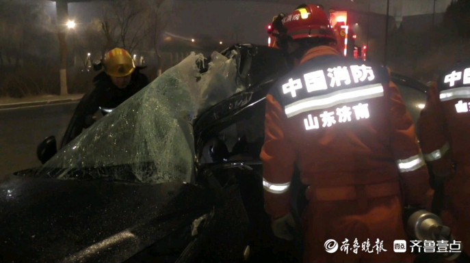 果然视频|雪夜,一轿车失控撞上路边灯杆,消防员破拆救人齐鲁晚报·齐鲁壹点客户端 昨天16:57原创1月18日晚,济南,一轿车行驶中疑因路滑失控撞上路边灯杆。接到求助,济南消防孙村救援站立即到场进行扩张作业,及时将男子抱出变形驾驶室,并将其交由120送往医院。 (齐鲁晚报·齐鲁壹点记者 尉伟 通讯员 刘纪元)