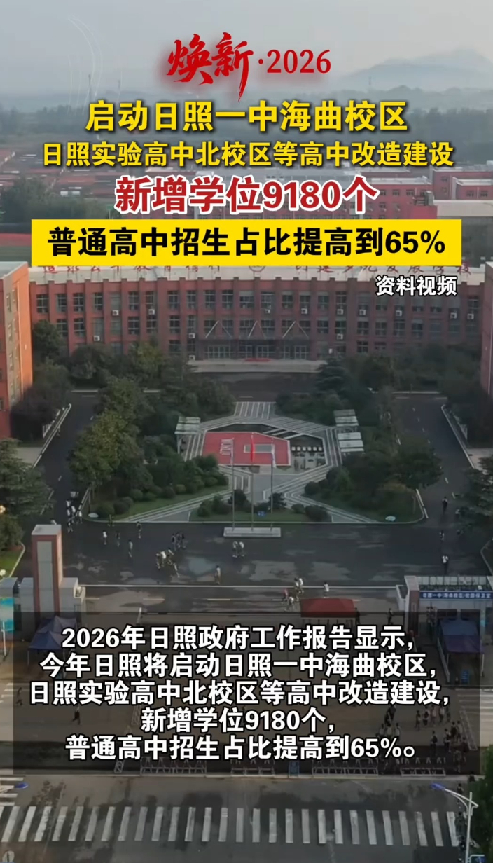 果然视频丨今年将启动日照一中海曲校区、实验高中北校区改造建设大众报业·齐鲁壹点 17:482026年日照政府工作报告显示,今年日照将启动日照一中海曲校区,日照实验高中北校区等高中改造建设,新增学位9180个,普通高中招生占比提高到65%。