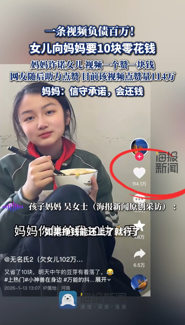 女儿向妈妈要10块零花钱,并发视频求赞母亲承诺1元1赞,意外获114万赞:信守承诺,会还钱