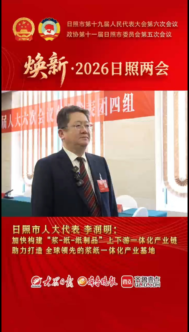 日照市人大代表李润明:加快构建“浆—纸—纸制品”上下游一体化产业链大众新闻 昨天10:45原创【2026日照两会】日照人大代表李润明:加快构建“浆—纸—纸制品”上下游一体化产业链,助力打造全球领先的浆纸一体化。(大大众新闻记者 丁兆霞 郑玥 刘涛)