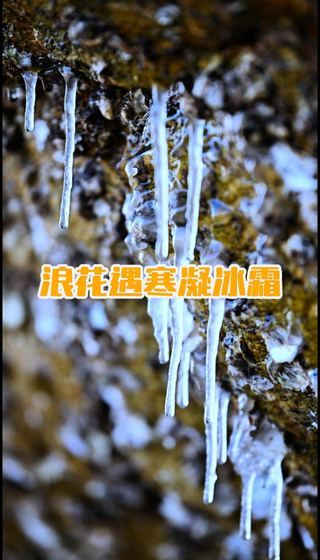 1月20日,日照任家台礁石公园,浪花遇寒凝冰霜。