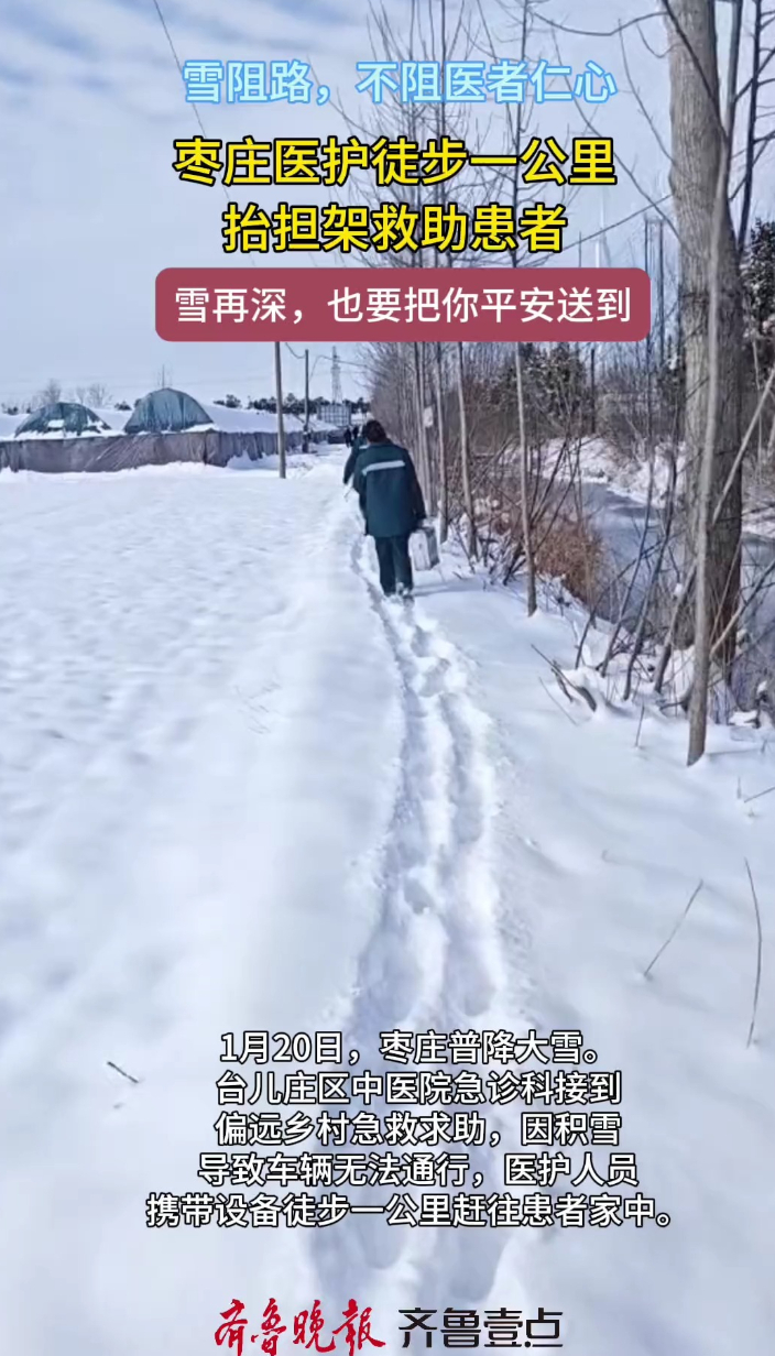 车辆受阻,徒步救援!枣庄医护徒步一公里雪中抬担架救助患者齐鲁晚报·齐鲁壹点客户端 19:36原创1月20日,枣庄普降大雪。台儿庄区中医院急诊科接到偏远乡村急救求助,因积雪导致车辆无法通行,医护人员携带设备徒步一公里赶往患者家中,用担架抬着患者在泥泞冰雪中艰难前行,最终患者成功得到救治。