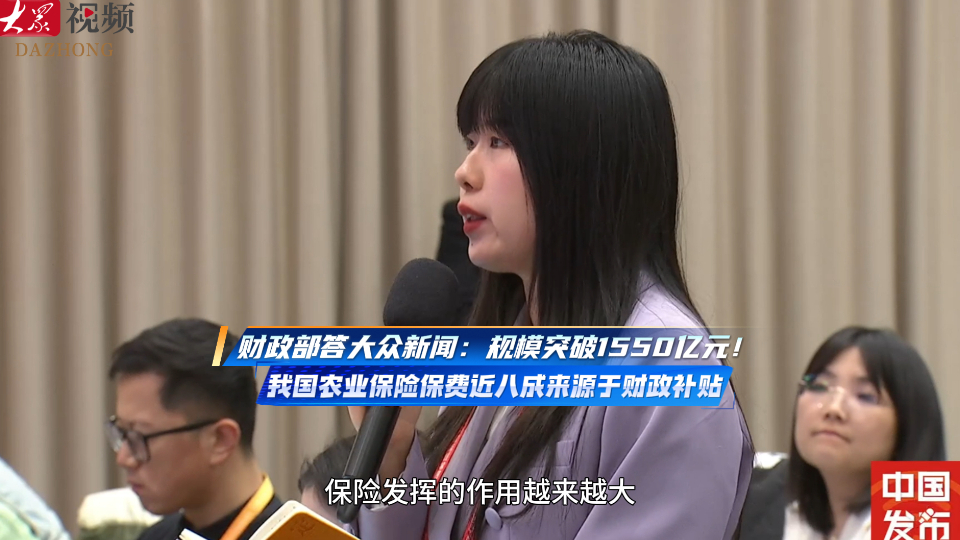 财政部答大众新闻:我国农业保险保费规模突破1550亿元,近八成来源于财政补贴大众新闻 20:27原创1月20日,国务院新闻办举行新闻发布会,介绍发挥积极财政政策作用,推动经济社会高质量发展有关情况。(大众新闻记者 张锡坤 董婉婉)