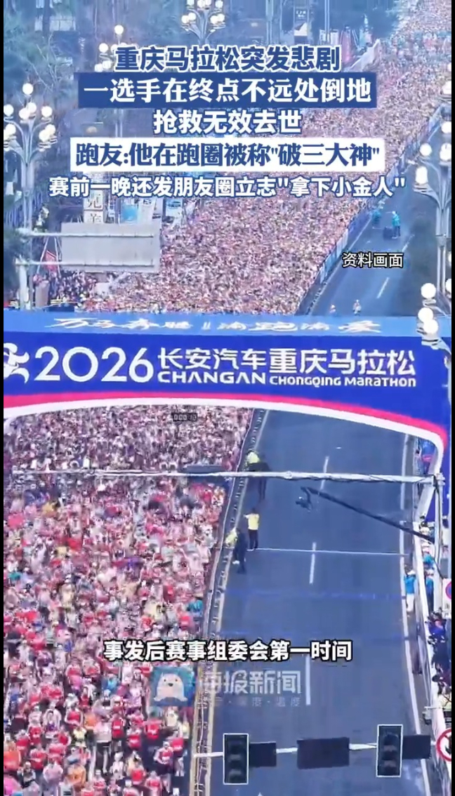 令人痛心!1月18日的重庆马拉松赛场突发意外,来自湖北孝感的跑者钟先生,在距离终点不远处突然倒地,经现场医护人员数秒内紧急施救,最终仍抢救无效不幸离世。