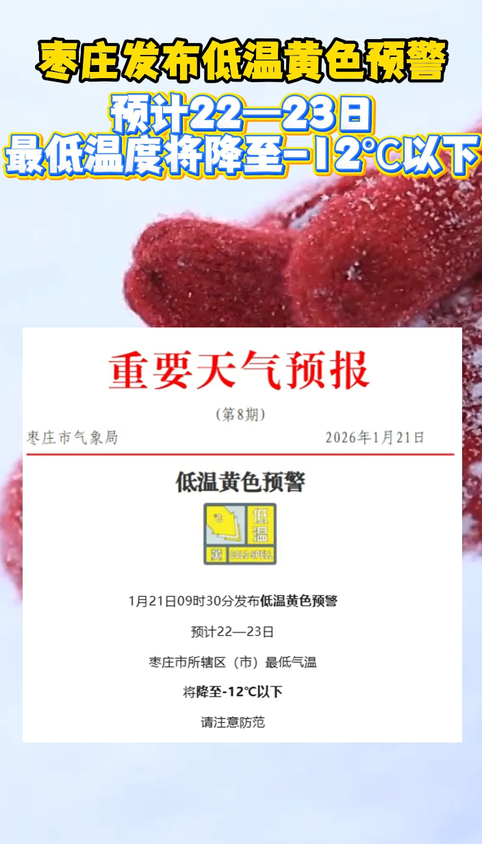 枣庄发布低温黄色预警,22—23日最低气温将降至-12℃以下