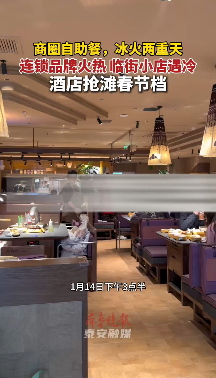 果然视频丨商圈自助餐,冰火两重天:连锁火热小店遇冷,酒店抢滩春节档齐鲁晚报·齐鲁壹点客户端 昨天11:46原创齐鲁晚报·齐鲁壹点 张亢 徐慧 工作日下午3点半,泰安万达商场内,部分自助连锁品牌门店三分之二的餐位被年轻食客占据,大学生群体占比超七成;而商场外临街的自助小店,20-40元的低价套餐却门可罗雀,多数门店闭门闲置。这是1月14日下午,记者在泰安万达商圈看到的景象。随着自助餐头部品牌加速下沉,这一“冷热分化”现象,正成为全国餐饮连锁化浪潮下的微观样本。