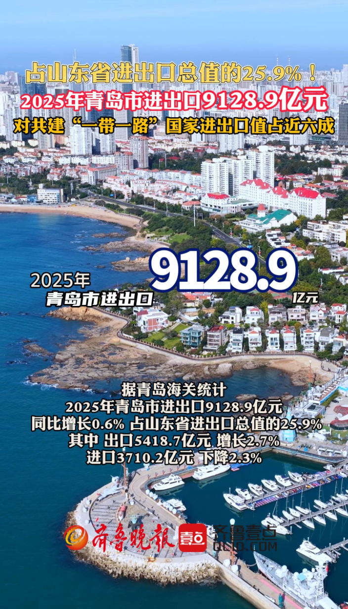 2025年,青岛市进出口9128.9亿元,同比增长0.6%,占山东省进出口总值的25.9%。2025年青岛有进出口实绩的外贸企业达2.88万家,增加7.5%,其中民营企业2.62万家,增加8.6%。民营企业进出口值6607.8亿元,增长5%,占全市进出口总值的72.4%。此外,青岛对共建“一带一路”国家进出口5460亿元,增长6.2%,占进出口总值的59.8%。