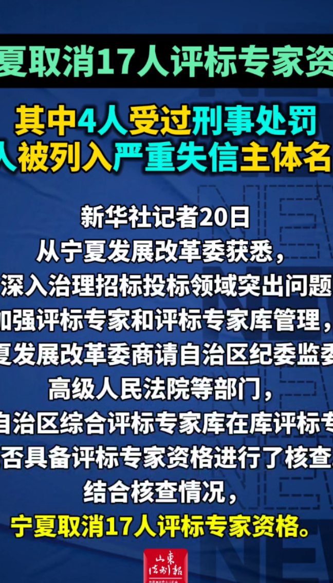 宁夏取消17人评标专家资格,其中4人受过刑事处罚,2人被列入严重失信主体名单