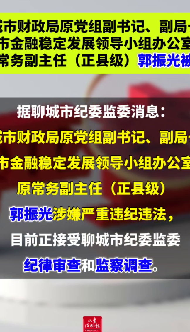 聊城市财政局原党组副书记、副局长、市金融稳定发展领导小组办公室原常务副主任(正县级)郭振光被查 昨天19:31 大众新闻·山东法制报 微信扫码扫码下载客户端据聊城市纪委监委消息:聊城市财政局原党组副书记、副局长、市金融稳定发展领导小组办公室原常务副主任(正县级)郭振光涉嫌严重违纪违法,目前正接受聊城市纪委监委纪律审查和监察调查。