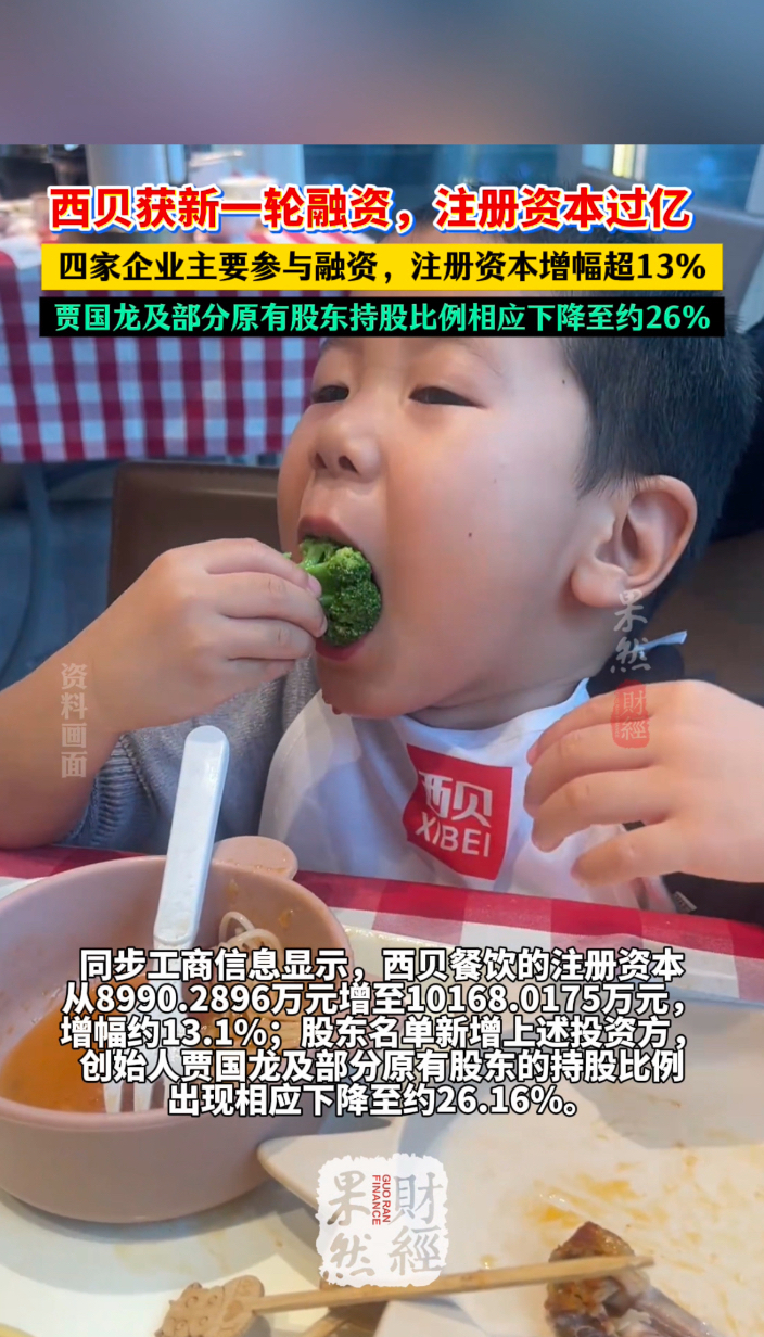 果然财经|西贝获新一轮融资,贾国龙等股东持股比例下降齐鲁晚报·齐鲁壹点客户端 昨天17:44原创内蒙古西贝餐饮集团有限公司获A轮融资。投资方包括台州新荣泰投资有限公司、呼和浩特市集体共创企业管理中心(有限合伙)、成都迅达光电有限公司、杭州舟轩股权投资管理合伙企业(有限合伙)等。同步工商信息显示,西贝餐饮的注册资本从8990.2896万元增至10168.0175万元,增幅约13.1%;股东名单新增上述投资方,创始人贾国龙及部分原有股东的持股比例出现相应下降至约26.16%。