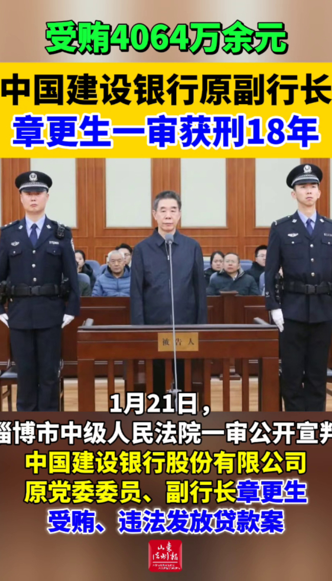 1月21日,淄博市中级人民法院一审公开宣判中国建设银行股份有限公司原党委委员、副行长章更生受贿、违法发放贷款案,对被告人章更生以受贿罪判处有期徒刑十三年,并处罚金人民币四百万元,以违法发放贷款罪判处有期徒刑十年,并处罚金人民币十万元,决定执行有期徒刑十八年,并处罚金人民币四百一十万元;追缴在案的章更生受贿所得财物及孳息依法上缴国库,不足部分继续追缴。