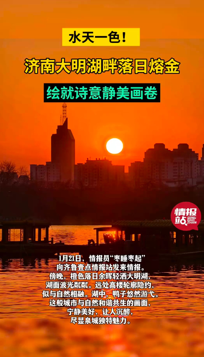 天气情报站|水天一色!济南大明湖畔落日熔金,绘就诗意静美画卷齐鲁壹点 | 昨天17:39 大众报业·齐鲁壹点 微信扫码扫码下载客户端1月21日,情报员“枣睡枣起”向齐鲁壹点情报站发来情报。傍晚,橙色落日余晖轻洒大明湖,湖面波光粼粼。远处高楼轮廓隐约,似与自然相融。湖中,鸭子悠然游弋。这般城市与自然和谐共生的画面,宁静美好,让人沉醉,尽显泉城独特魅力。
