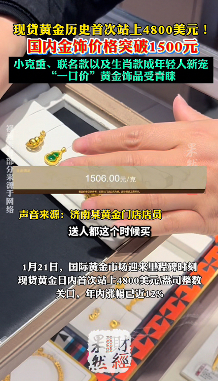果然财经|现货黄金首次站上4800美元!“一口价”金饰受青睐齐鲁晚报·齐鲁壹点客户端 昨天19:25原创1月21日,国际黄金市场迎来里程碑时刻,现货黄金日内首次站上4800美元/盎司整数关口,年内涨幅已近12%。受此带动,国内金饰价格同步飙升,中国黄金足金饰品价格突破1500元/克,达到1506元;老凤祥、周生生等头部品牌报价也逼近1500元,分别为1498元/克和1495元/克。