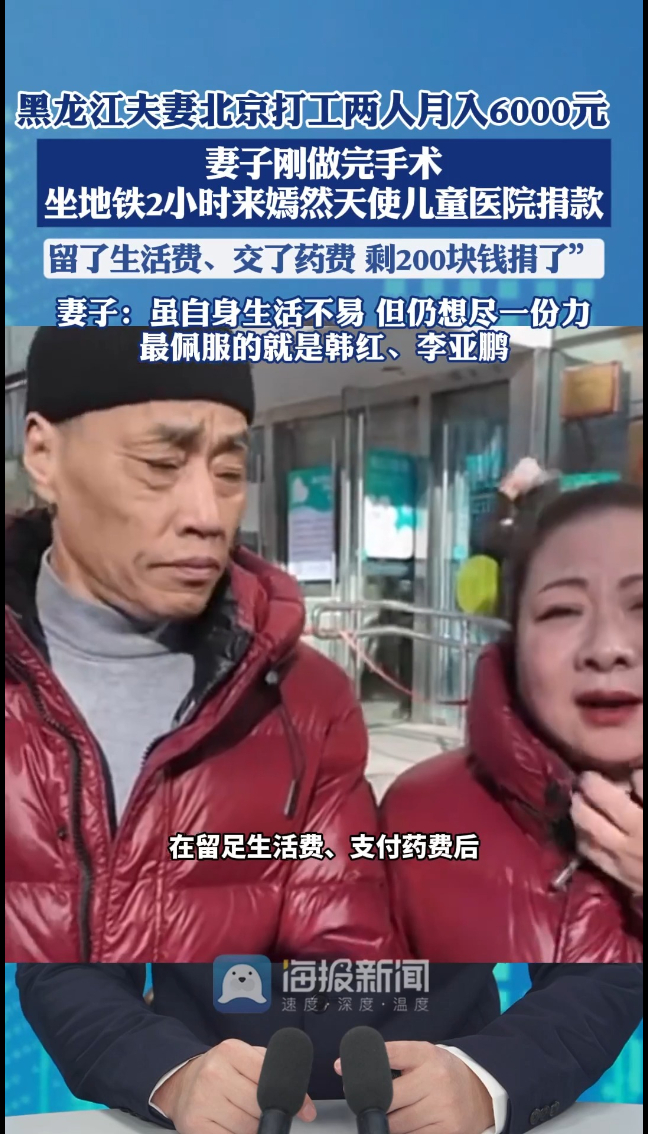 主播说丨在京务工夫妻专程来嫣然医院捐款,说尽点绵薄之力 昨天19:29 原创大众新闻·海报新闻 微信扫码扫码下载客户端自己再困难,也要给嫣然天使儿童医院捐钱。一对来自黑龙江的夫妻在接受采访时表示,两人打工月收入共6000元,妻子刚做完手术。在留足生活费、支付药费后,他们带着仅剩的200元,坐了两个多小时地铁,专程前往嫣然天使儿童医院捐款。妻子称,虽自身生活不易,但仍想尽一份力,还提到最佩服的人就是韩红与李亚鹏。(海报新闻综合 今视频长天新闻 编辑 冯浩 黄晓荣)