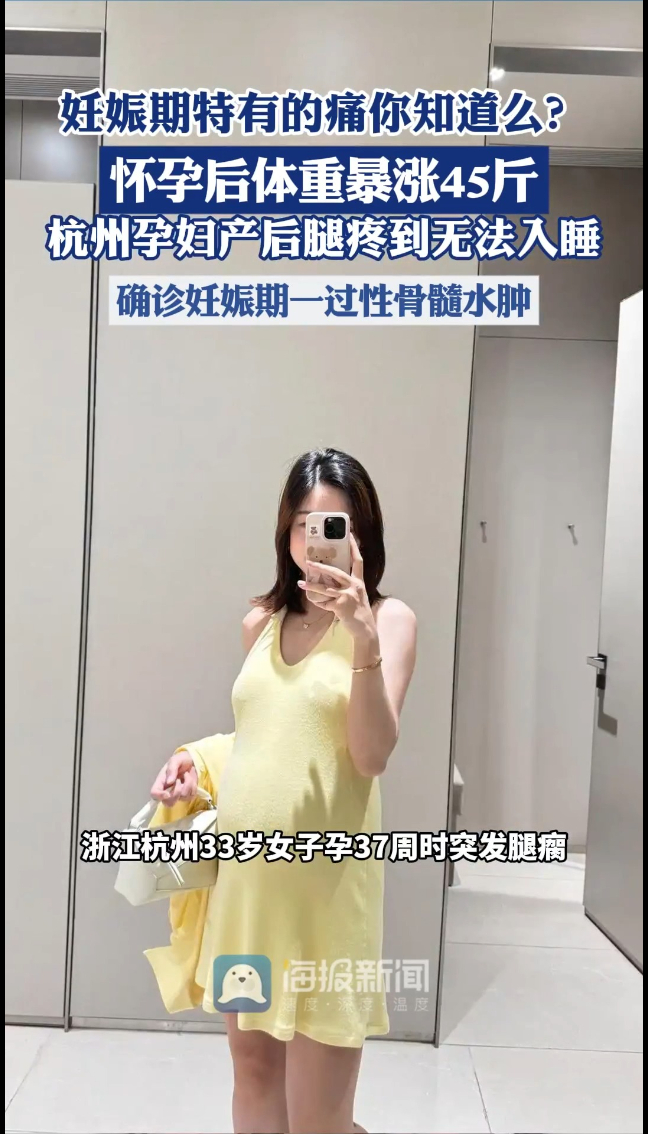 妊娠期特有的痛你知道么?浙江杭州33岁女子孕37周时突发腿瘸,医生都没在意,孕38周后她选择剖腹产,本以为可以缓解疼痛,没想到进入急性期,疼痛非但没有缓解,加上剖腹产的刀口疼,反倒“疼得睡不着觉”,疼到脚抽筋冒汗,整个人都抽搐。最终经过医生诊断,因怀孕时体重增长过大,她被确诊为“妊娠期一过性骨髓水肿”,经过3个月的康复治疗,目前已恢复90%。