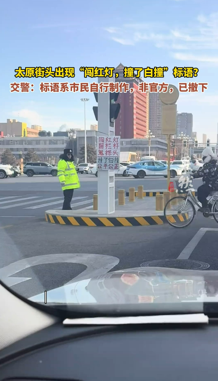 果然视频|太原街头现“撞了白撞”标语?交警:系市民制作,已撤齐鲁晚报·齐鲁壹点客户端 昨天20:31原创1月20日,有山西网友发帖称,看到太原五一广场附近,有一则醒目的警示语,上面写道:“闯红灯,翻栏杆,鬼探头,撞了白撞,公平公正”。记者以市民身份向太原市民热线咨询此事,21日晚,当地交警回应称,标语系附近市民所做,非官方标牌,现已撤下。