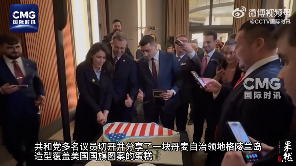 果然视频·看天下|美共和党议员切开一块“格陵兰岛蛋糕”齐鲁壹点 | 01-22 原创齐鲁晚报·齐鲁壹点客户端 微信扫码扫码下载客户端当地时间1月20日晚,在美国首都华盛顿特区的肯尼迪中心,共和党多名议员切开并分享了一块丹麦自治领地格陵兰岛造型、覆盖美国国旗图案的蛋糕。据称当晚的活动是号称美国“共和党国家复兴”组织成立一周年的聚会。