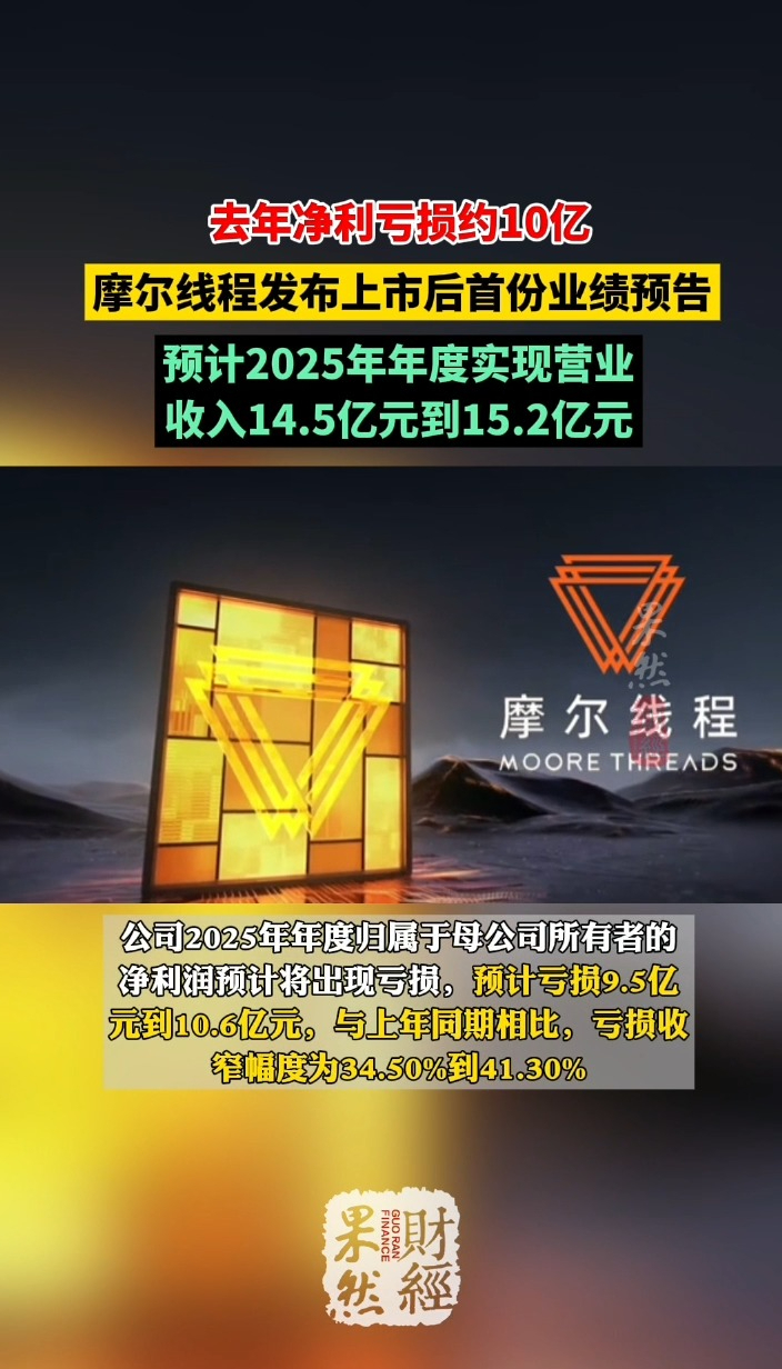 果然财经|去年净利亏损约10亿,摩尔线程发上市后首份业绩预告齐鲁晚报·齐鲁壹点客户端 01-22原创1月21日讯,摩尔线程发布业绩预告称,预计2025年年度实现营业收入14.5亿元到15.2亿元,与上年同期相比,收入增长幅度为230.70%到246.67%。