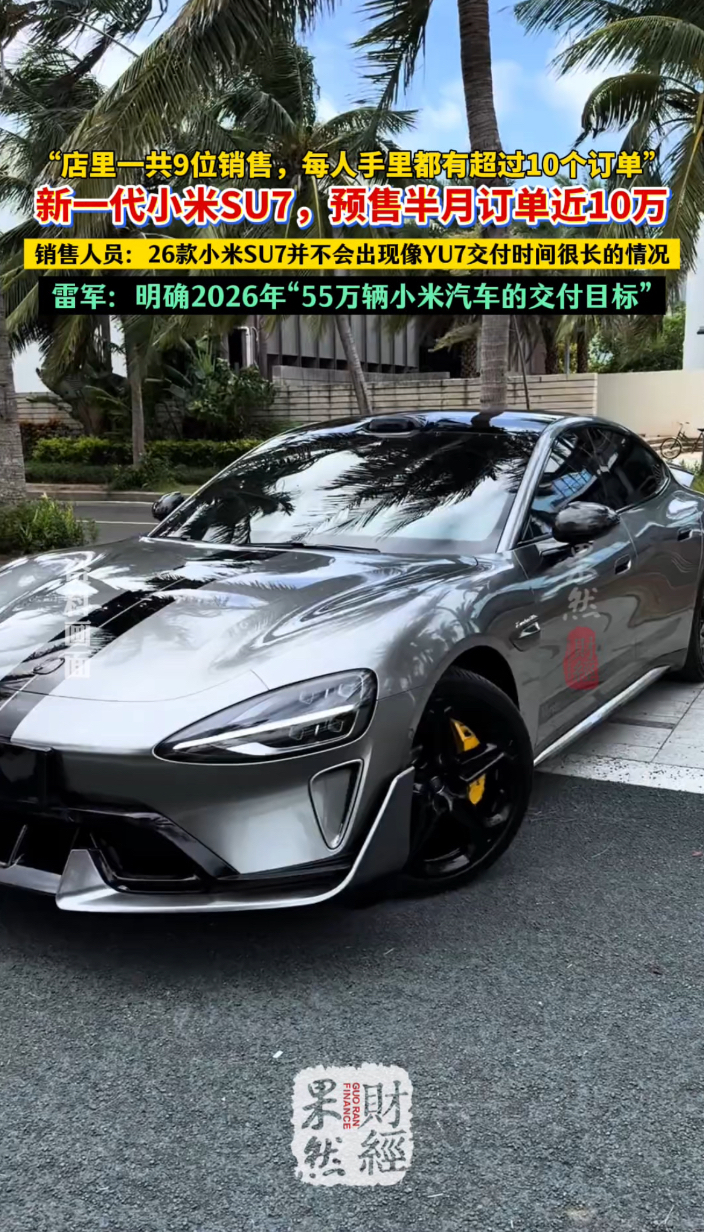 果然财经|26款小米SU7预售近十万!这次交付不会太久齐鲁晚报·齐鲁壹点客户端 01-23原创在上海和武汉的两家小米汽车门店,新一代小米SU7的订单量均已突破百单。“我们店里一共有9位销售,每个人手里都有超过10个订单。”一位上海的销售人员向记者透露。按照目前小米汽车477家门店粗略估算,自1月7日开启小定后,已累计收获近10万订单。