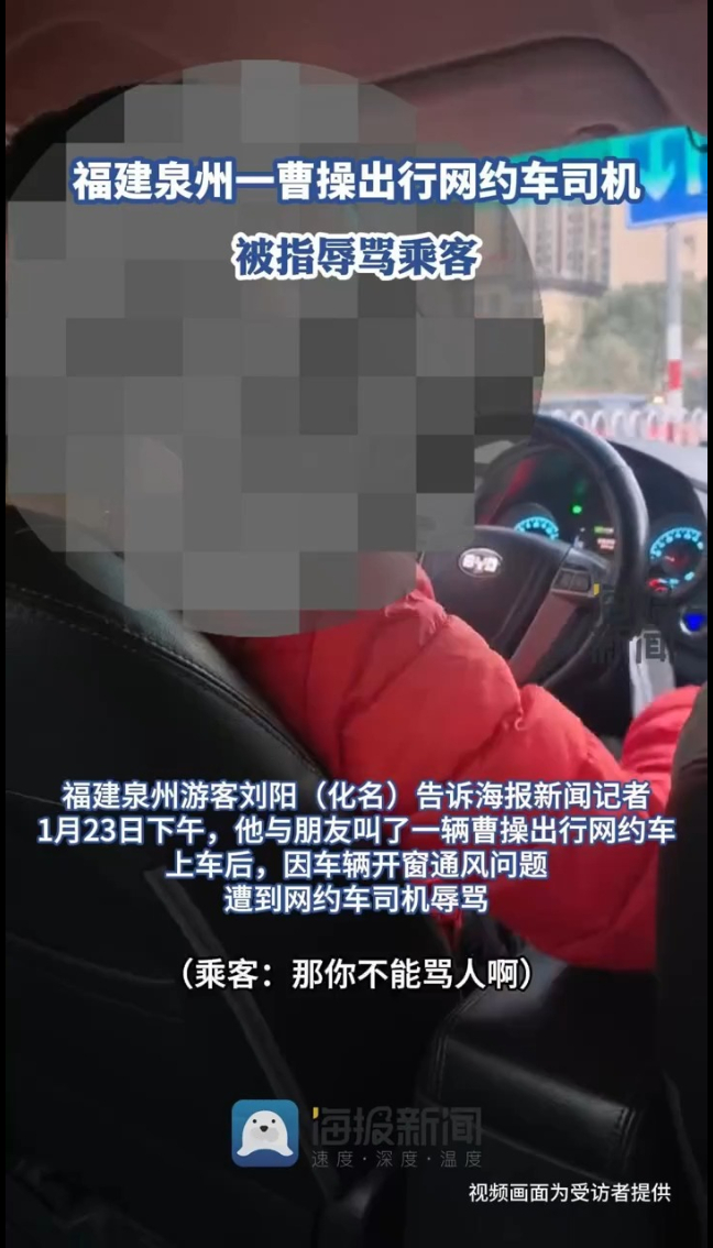 “泉州网约车司机的态度,让我开眼了。”1月23日晚间,福建泉州游客刘阳(化名)告诉海报新闻(报料微信:HaibaoNewsSw)记者,23日下午,他与朋友叫了一辆曹操出行网约车,上车后,因车辆开窗通风问题,遭到网约车司机辱骂。