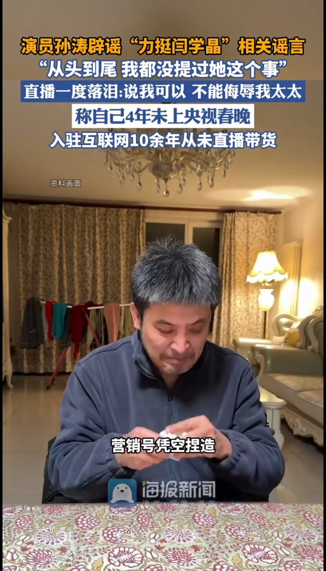 演员孙涛辟谣“力挺闫学晶”相关谣言:相关内容都是营销号凭空捏造。1月23日,演员孙涛发布视频,他称1月2日的直播全程未提及闫学晶,网传的拍案而起、不让提闫学晶等夸张表述均为虚假信息。同时孙涛还澄清了衍生谣言,自己已连续4年未上央视春晚,入驻互联网10余年也从未直播带货。孙涛表示,谣言发酵后亲友都产生误解,还有营销号伪造他的道歉信,更有言论侮辱其妻子,这也是他公开回应的重要原因,谈及妻子时他一度落泪:说我可以 不能侮辱我太太,她非常优秀。此前孙涛曾尝试冷处理,但谣言持续扩散,目前他已找到直播完整回放,委托律师锁定造谣营销号,固定证据后将依法起诉并报案。