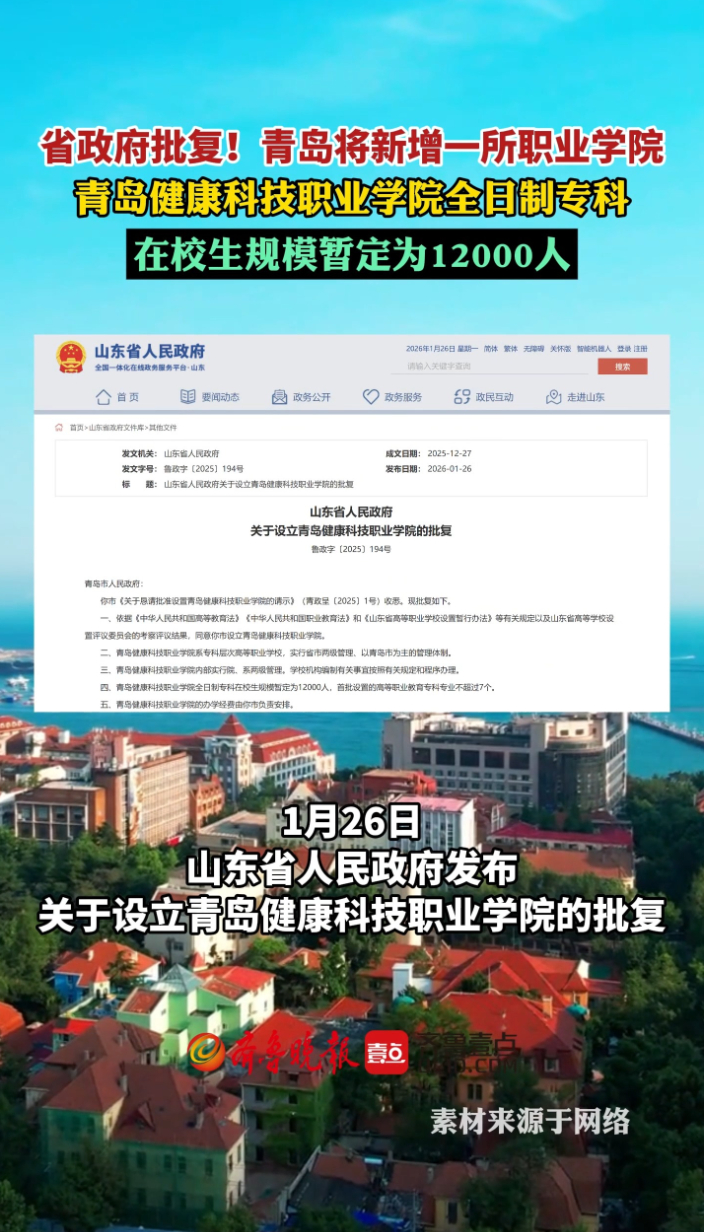 果然视频丨省政府批复!青岛将设立青岛健康科技职业学院齐鲁晚报·齐鲁壹点客户端 01-26原创1月26日,山东省人民政府发布关于设立青岛健康科技职业学院的批复。根据批复,青岛健康科技职业学院系专科层次高等职业学校,实行省市两级管理、以青岛市为主的管理体制。青岛健康科技职业学院全日制专科在校生规模暂定为12000人,首批设置的高等职业教育专科专业不超过7个。(齐鲁晚报·齐鲁壹点 高雅洁 实习生 张文钰)