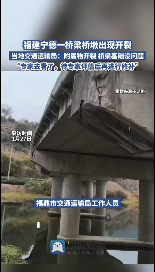 福建宁德一桥梁桥墩出现开裂 交通运输局:附属物开裂,桥梁基础没问题