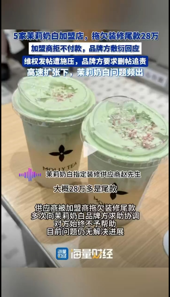 海量财经丨装修商控诉茉莉奶白:拖欠28万尾款近两年,加盟商及品牌方“一拖再拖”