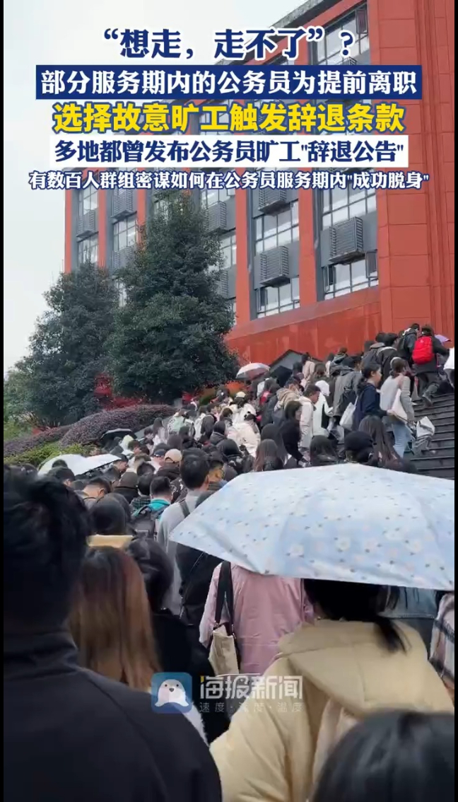 这不是个例。近来,贵州贵阳、湖南永州等多地都曾公开发布“辞退公告”,对连续旷工的公务员作出辞退处理。社交平台上,甚至出现了近300人的群组,交流如何通过类似方式在服务期内“成功脱身”。为何选择这条看似“自毁”的路?有当事人坦言,相较于主动辞职可能面临的档案或诚信问题,因旷工被辞退仅影响五年内再考公,对个人转型“阻力更小”。