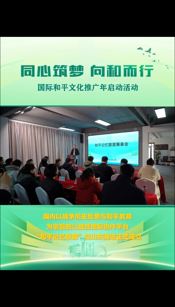 潍坊国际和平文化推广年|“和平记忆联盟”在潍坊成立齐鲁晚报·齐鲁壹点客户端 02-03原创2月3日,国内以战争历史反思与和平教育为宗旨的公益性馆际协作平台——“和平记忆联盟”在山东潍坊正式成立。该联盟由潍县西方侨民集中营旧址博物馆联合全国24家纪念馆、博物馆及相关研究机构共同发起,成立大会于潍县西方侨民集中营旧址博物馆举行,联盟成立后将致力于联合发挥平台优势,促进和平类文化遗产保护利用,向世界讲好和平故事。齐鲁晚报·齐鲁壹点 胡晓雪 王钟玉