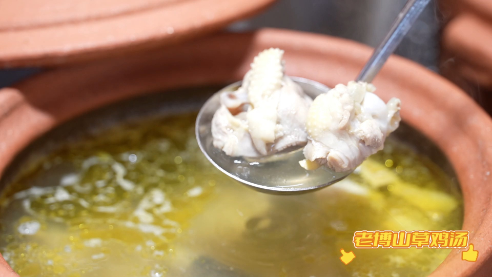 关键是需要小火慢炖一个半钟头,炖到鸡肉脱骨、汤色清澈,全程不添水不翻搅,就是突出鸡肉本真的鲜香味道。老博山草鸡汤是老百姓家家户户过年必备美食,最能体现出老博山的烟火气。