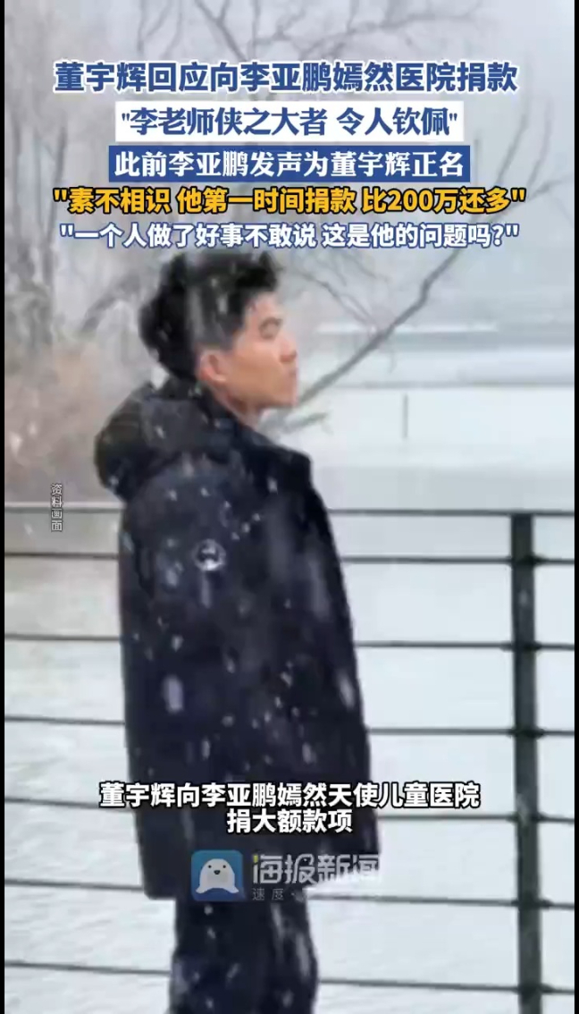 董宇辉向李亚鹏嫣然天使儿童医院捐大额款项,本人回应:“李老师侠之大者,令人钦佩”。此前李亚鹏在直播中证实,董宇辉在医院陷关停危机后第一时间捐款,他特别强调两人此前素不相识,并透露捐款金额“不是小钱,比200万还多”,李亚鹏还表示:“一个人做了好事,而且是真金白银做了事情,不敢说,这是他的问题吗?”