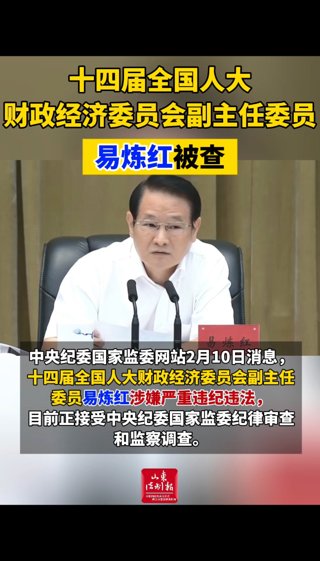 十四届全国人大财政经济委员会副主任委员易炼红被查山东法制报 | 02-10 现场大众新闻·山东法制报 微信扫码扫码下载客户端中央纪委国家监委网站2月10日消息,十四届全国人大财政经济委员会副主任委员易炼红涉嫌严重违纪违法,目前正接受中央纪委国家监委纪律审查和监察调查。