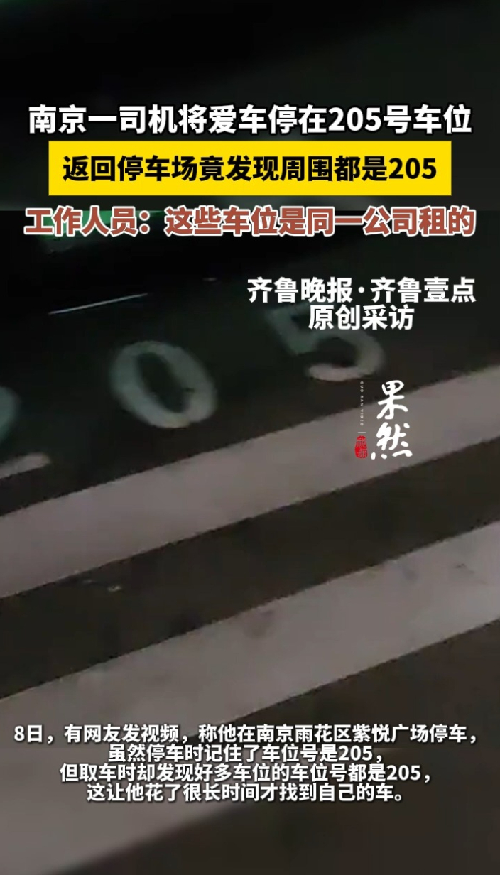 果然视频|南京一停车场内多车位同号,工作人员:这些车位是同一公司租的 02-10 原创齐鲁晚报·齐鲁壹点客户端 微信扫码扫码下载客户端8日,有网友发视频,称他在南京雨花区紫悦广场停车,虽然停车时记住了车位号是205,但取车时却发现好多车位的车位号都是205,这让他花了很长时间才找到自己的车。齐鲁晚报·齐鲁壹点记者 袁野