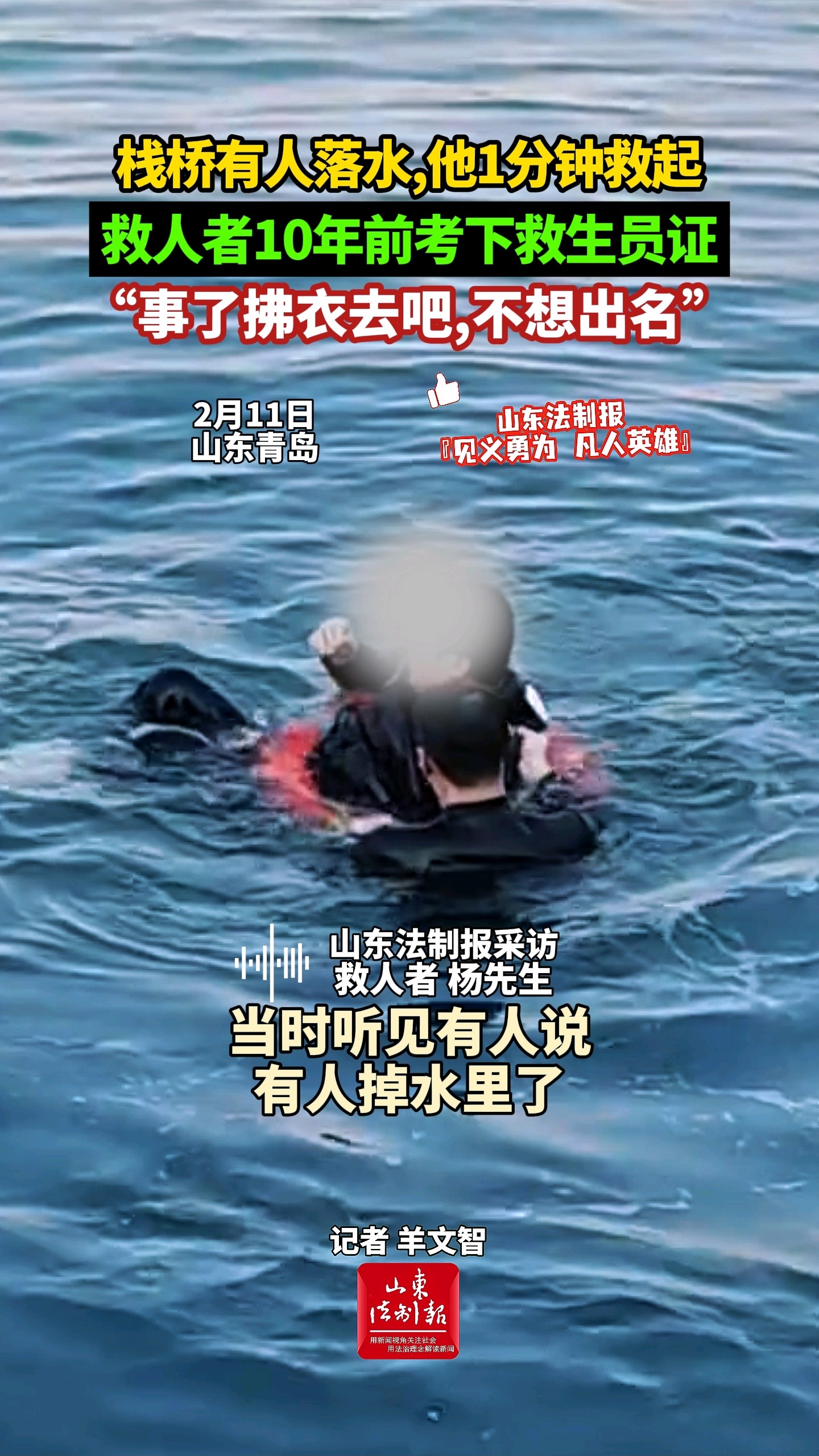 栈桥有人落水,他1分钟救起,救人者10年前考下救生员证,“事了拂衣去吧,不想出名” 02-19 原创山东法制报 微信扫码扫码下载客户端2月11日下午,青岛栈桥边一名男子不慎落水。正在附近遛弯的杨先生发现后,第一时间跑到岸边下水施救,仅用1分钟左右就将落水者安全救起。记者了解到,杨先生10年前就考取了救生员证,此后曾多次出手救人。面对网友的赞许,他低调表示:“救人是应该的,事了拂衣去吧,不想出名。”(大众新闻·山东法制报记者 羊文智)