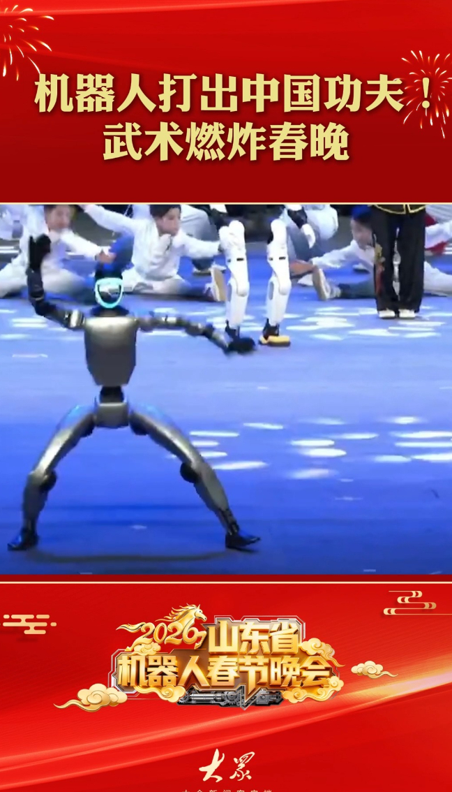 机器人打出中国功夫!武术燃炸春晚大众新闻 02-14原创2月14日(腊月二十七),2026山东省机器人春晚在济宁举办。在情景武术表演环节中,机器人精准模仿传统武术动作,不仅稳稳地扎出马步,还流畅地打出拳法和腿法,每一招每一式都展现出了高超的技术水平与协调性。(大众新闻记者 刘兵 吕光社 王贵媛 马静慧)