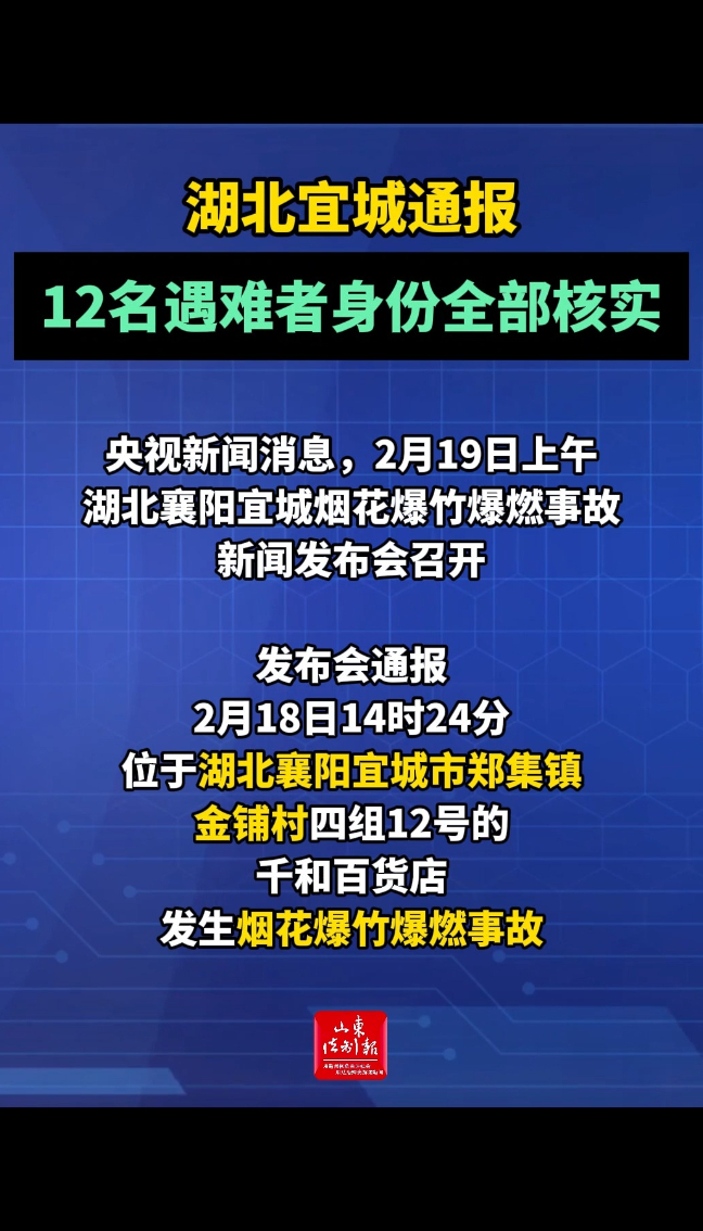 发布会通报,2月18日14时24分,位于湖北襄阳宜城市郑集镇金铺村四组12号的千和百货店发生烟花爆竹爆燃事故。接到报警后,救援人员于14时33分赶到现场,立即开展火情扑救、人员搜救、现场管控等工作,15时12分现场明火被扑灭。