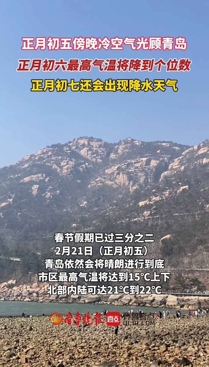 春节假期已过三分之二,2月21日(正月初五),青岛依然会将晴朗进行到底,市区最高气温将达到15℃上下,北部内陆可达21℃到22℃。不过这份温暖即将迎来转折,受冷空气影响,21日夜间起青岛风力增大,气温将直线下滑,22日(正月初六)大部地区的最高气温将仅有个位数;到了23日(正月初七),青岛市还会出现降水天气。正值假期返程高峰,请及时关注最新天气信息。