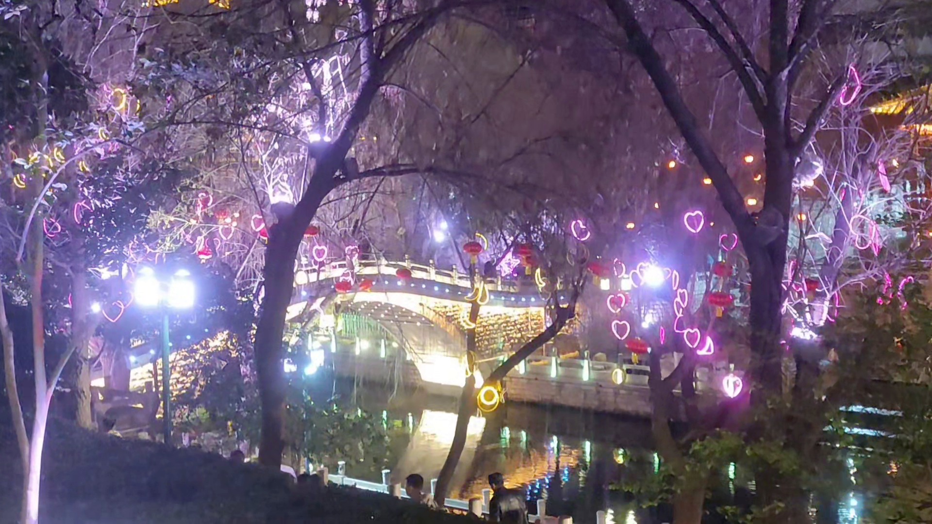 夜色中,彩灯闪烁,一河美景如仙境。