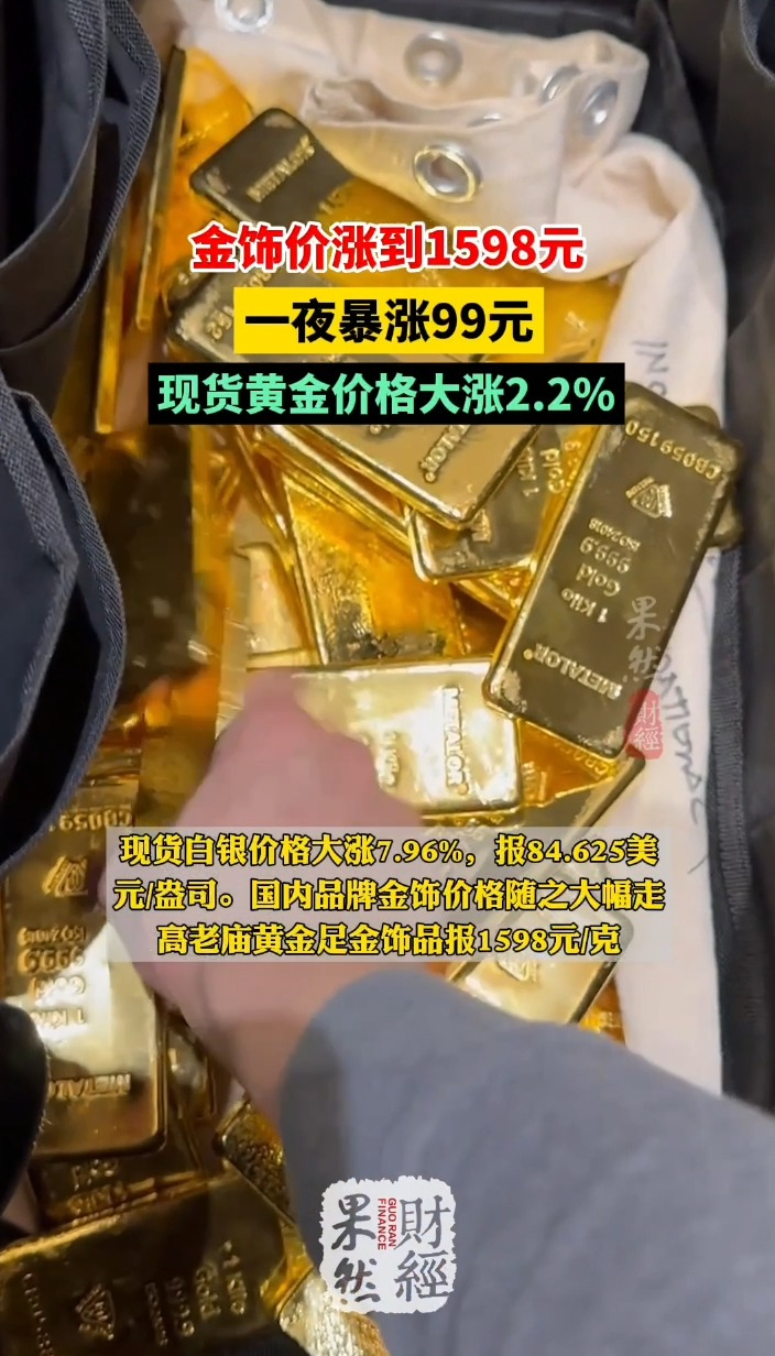 果然财经|金饰价格一夜暴涨99元至1598元齐鲁壹点 | 02-21 原创齐鲁晚报·齐鲁壹点客户端 微信扫码扫码下载客户端2月20日,以黄金、白银为首的贵金属市场深夜狂飙,截至收盘,现货黄金价格大涨2.2%,重新站上5100美元/盎司。现货白银价格大涨7.96%,报84.625美元/盎司。国内品牌金饰价格随之大幅走高老庙黄金足金饰品报1598元/克。