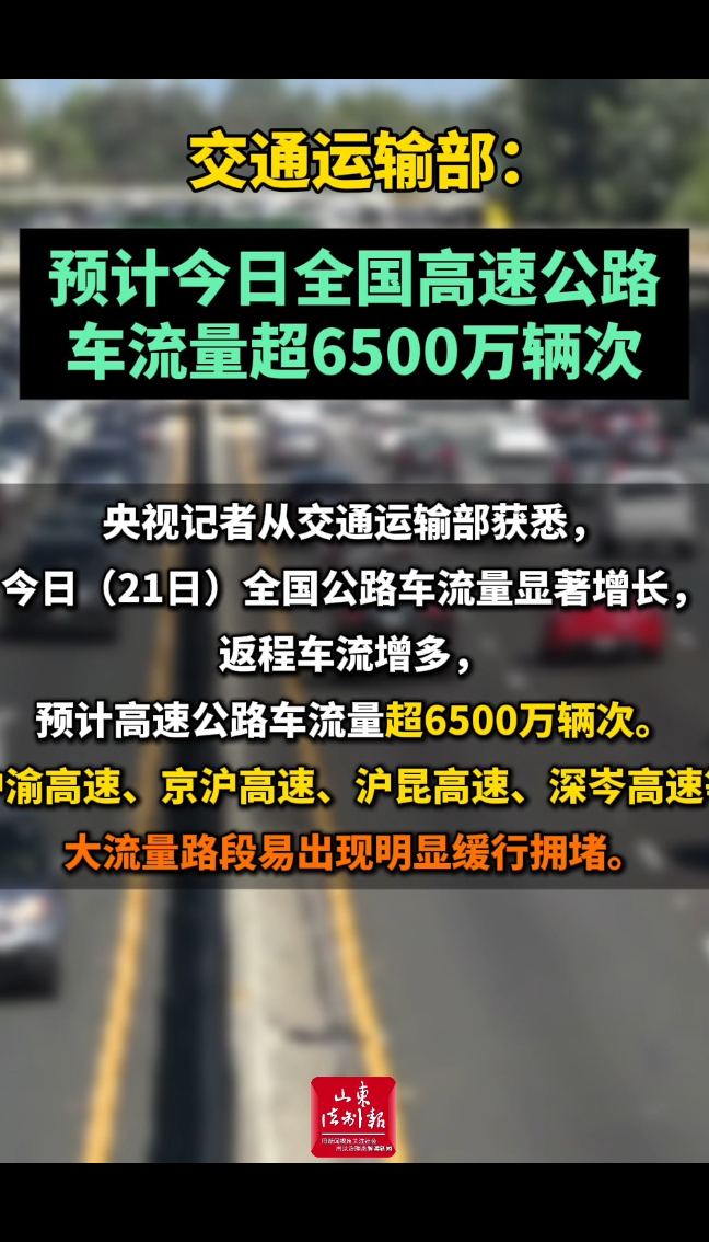 交通运输部:预计今日全国高速公路车流量超6500万辆次山东法制报 | 02-22 央视新闻 微信扫码扫码下载客户端央视记者从交通运输部获悉,今日(21日)全国公路车流量显著增长,返程车流增多,预计高速公路车流量超6500万辆次。沪渝高速、京沪高速、沪昆高速、深岑高速等大流量路段易出现明显缓行拥堵。